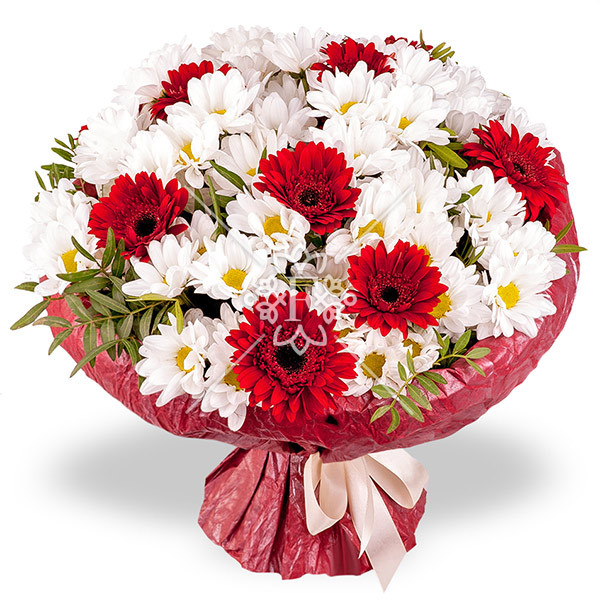 Белоснежные, воздушные и чарующие своей простотой и элегантностью хризантемы  сочетаются  здесь с ярко красными герберами! Идеальная, гармоничная композиция!